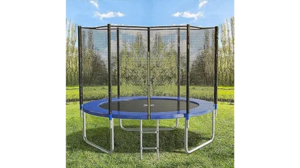 Ensuring safety is a essential aspect when selecting a trampoline, and the right safety features can make all the difference in preventing injuries. Look for enclosure nets, padded poles, and secure zipper entrances to prevent falls and keep jumpers safely inside. Make sure the trampoline meets ASTM safety standards, guaranteeing it adheres to strict safety requirements. Safety pads covering springs and frame components are critical to reduce the risk of foot or hand injuries during jumps. Curved or angled poles and reinforced net attachments can minimize impact points, enhancing overall safety. Additionally, ground anchors and stability systems help prevent tipping or shifting, especially in windy conditions. Prioritizing these safety features ensures a safer, more enjoyable bouncing experience for everyone.