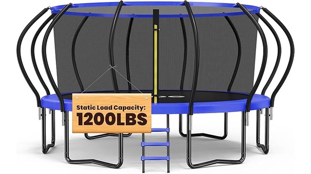 The Trampoline 1500LBS Outdoor Trampoline stands out as an excellent choice for those seeking a durable, large-capacity option that can accommodate both kids and adults. Available in sizes from 8 to 16 feet, it’s windproof, ASTM approved, and features a safety enclosure net, soft foam-padded safety poles, and sturdy U-shaped legs for stability. It includes a basketball hoop, ladder, springs, safety pad, and jumping mat, making setup straightforward. Built to support up to 1200 pounds and tested with over 20,000 jumps, it combines safety, fun, and durability—perfect for family outdoor activities and creating lasting memories.