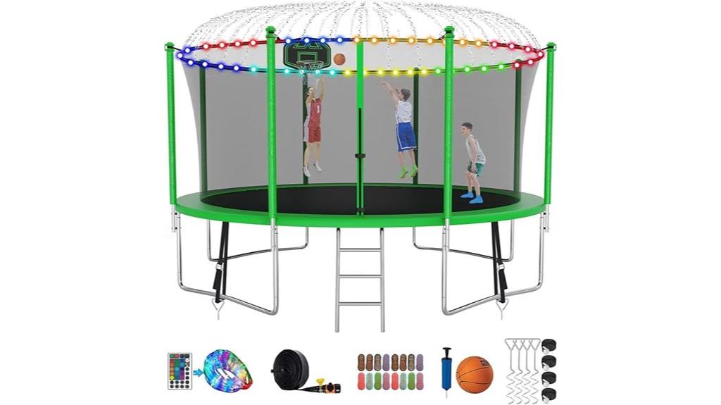 If you’re looking for a safe and durable outdoor trampoline that can accommodate multiple jumpers, the JoyBerri model stands out with its ASTM certification and thorough safety features. Its outward-curving poles and extra-strong safety net eliminate gaps, ensuring full protection. Ground stakes add stability, and a 330-pound weight limit makes it suitable for various users. Built from rust-proof galvanized steel, it withstands weather and time. The trampoline offers sizes from 8ft to 16ft, with fun accessories like LED lights, a sprinkler, and a ladder. Customers praise its sturdy build, safety design, and easy setup, making it a top choice for family fun.