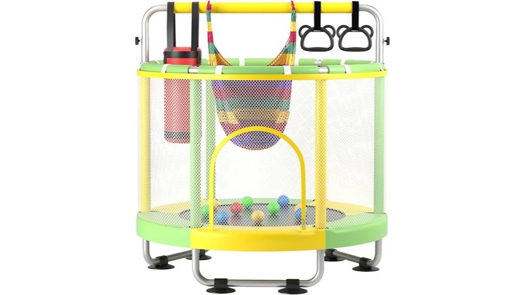 For parents seeking a versatile and safe trampoline for their young children, the Inch Kids Trampoline with Enclosure stands out as an excellent choice. Its thick steel frame, three U-shaped legs with non-slip suction pads, and 360° safety pad create a robust, secure bouncing environment. The included adjustable gymnastics bar promotes physical fitness and balance, supporting kids of all sizes with a capacity of up to 440 lbs. Plus, fun accessories like toys, rings, and a swing keep children engaged. Its quiet stability, vibrant design, and excellent customer support make it a reliable, entertaining gift that encourages active play indoors and outdoors.