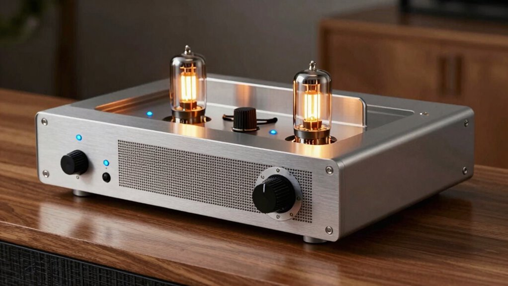 Mode switching features markedly enhance a tube amplifier’s versatility by allowing users to easily toggle between different sound profiles, such as triode and ultra-linear modes. This quick adjustment is usually controlled by a dedicated button or switch, often located on the back or control panel, making it simple to switch modes during listening. Some models even incorporate a red selection button for seamless changes between tube types and operational modes. This capability provides tailored audio experiences—whether you want warm, vintage tones or a more dynamic, powerful sound. Well-designed mode switching guarantees minimal disruption to audio quality and offers user-friendly operation, making it accessible for both beginners and audiophiles. It’s a key feature that maximizes a tube amplifier’s adaptability to different listening preferences.