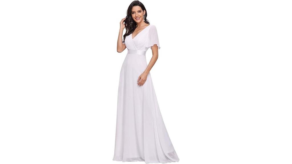 If you’re seeking an elegant, budget-friendly gown that flatters a variety of body types, the Ever-Pretty Womens V-Neck Long Sleeve Floor-Length Ruched Chiffon Formal Dress might be your ideal choice for 2025 weddings. While many find it true to size when ordered correctly, it’s important to size up since the dress has no stretch and runs small for some. The lightweight chiffon fabric feels comfortable, and the flattering fit emphasizes curves with ruching details. Keep in mind, some minor tailoring may be needed, especially for shorter heights. Overall, it’s a stylish, affordable option that looks sophisticated, especially when steamed or pressed before wearing.