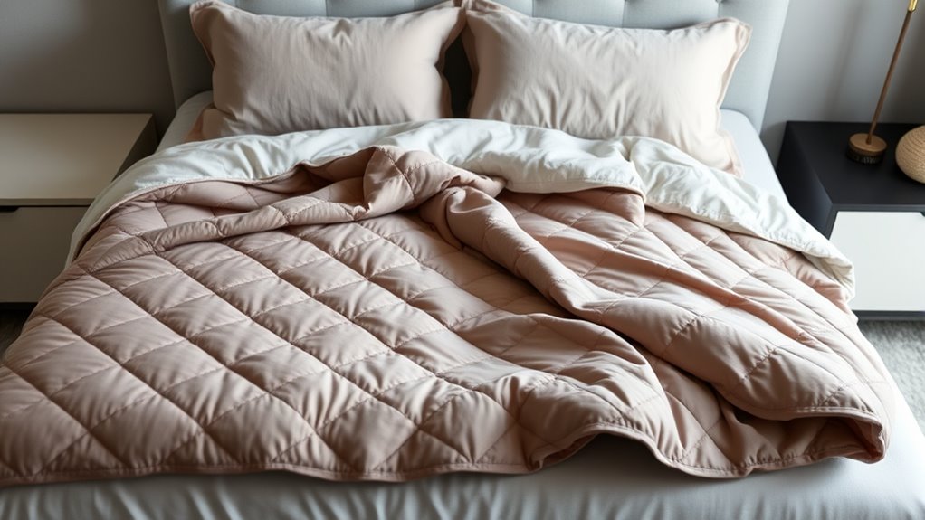 Wondering how to keep cool with a weighted blanket? Cooling technology features are key. Many blankets use specialized fibers like Arc-chill or mica-infused fabrics that absorb and dissipate heat, providing a prolonged cooling effect. A high thread count, such as 400TC, boosts durability and enhances heat absorption, improving overall cooling performance. Breathable materials like microfiber, rayon from bamboo, or mesh fabrics promote airflow, preventing heat buildup during sleep. Some blankets even have double-sided designs, with cooling fibers on one side and warmer fabrics on the other, offering seasonal versatility. Proper construction also matters—small compartments and secure stitching prevent bead shifting, ensuring even pressure and reducing localized heat spots. These features work together to keep you comfortably cool all night.