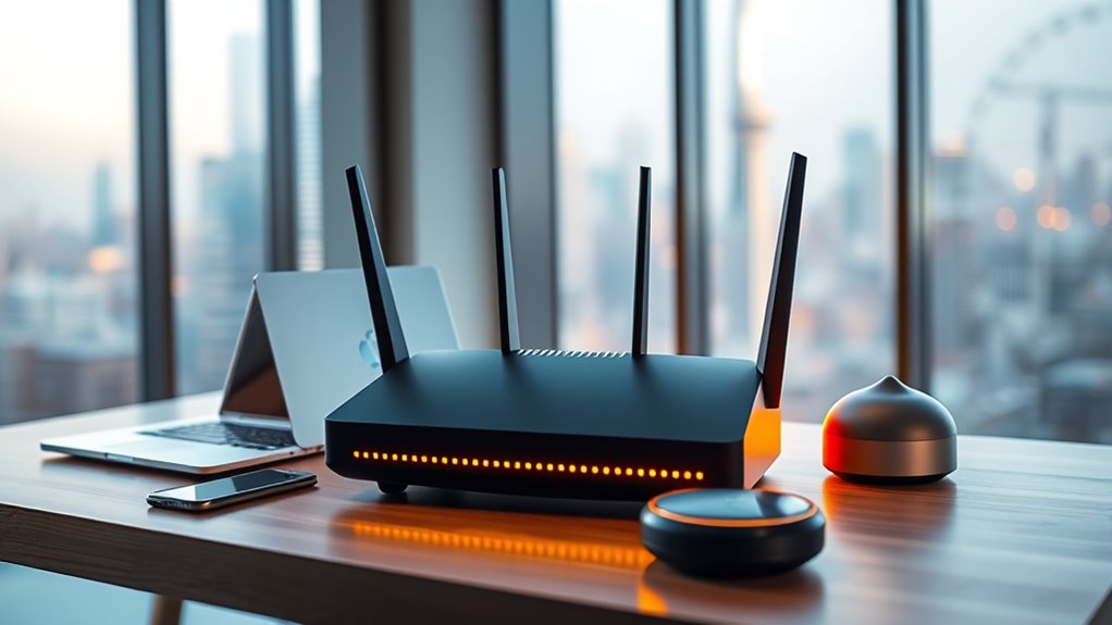 To make certain your new Wi-Fi 6 router works seamlessly with your devices, it’s crucial to verify that it supports the 802.11ax standard, which guarantees compatibility with the latest gadgets. Beyond that, check if the router is compatible with your internet service provider and modem type to avoid setup issues. It’s also smart to confirm if it supports backward compatibility with older Wi-Fi standards like Wi-Fi 5 and Wi-Fi 4, ensuring your existing devices stay connected. If you use smart home devices or plan to set up a mesh network, verify the router’s compatibility with those ecosystems. Ultimately, review supported security protocols to guarantee your network’s safety matches your security needs, giving you peace of mind alongside fast, reliable connections.