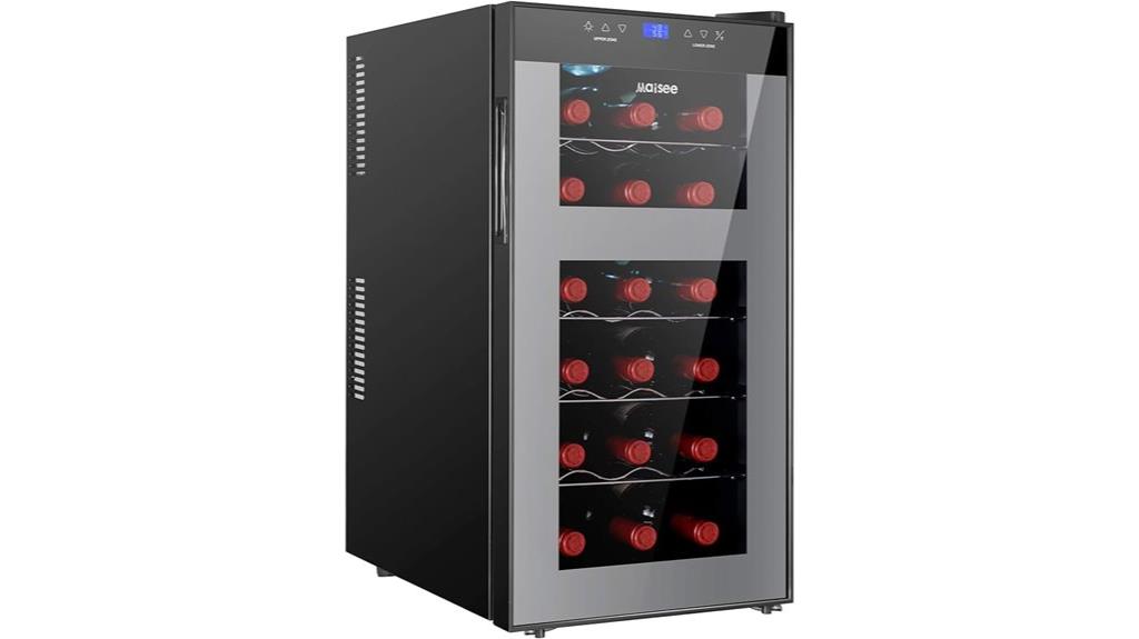 The Maisee dual zone wine cooler is perfect for wine enthusiasts who want to keep different types of wine at their ideal temperatures without taking up too much space. It stores up to 18 bottles in a compact design, making it ideal for living rooms, offices, or kitchens. With two adjustable temperature zones—44-54°F for whites and 54-65°F for reds and sweet wines—it guarantees each wine is perfectly chilled. Its quiet, low-vibration operation maintains wine quality, while double-paned glass and UV-resistant interior lighting defend against external damage. Certified for energy efficiency and backed by a one-year warranty, this cooler offers reliable, stylish wine storage.