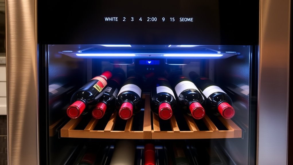 Choosing the right temperature zone control for a dual-zone wine fridge is essential because it directly impacts how well your wines are preserved and enjoyed. Precise control, often within 1°F, ensures consistent temperatures that protect wine flavors, aromas, and aging potential. Adjustable settings allow me to customize each zone for specific wine types—white wines at around 45°F and reds at about 60°F—enhancing my drinking experience. Digital control panels make it easy to monitor and adjust temperatures accurately, giving peace of mind. Proper zone separation prevents fluctuations from affecting either compartment, maintaining stable environments for each. Ultimately, effective temperature regulation ensures my wines are stored in optimal conditions, ready to be enjoyed at their best whenever I want.