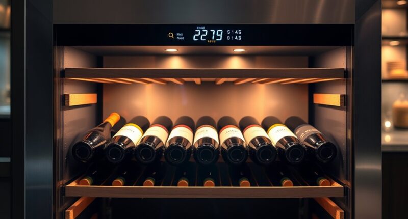 Imagine the perfect wine storage experience—crisp, balanced, and just right. Many models I’ve seen now offer customizable humidity settings, giving you control over your bottles’ environment. This means you can tailor humidity levels for long-term aging or immediate enjoyment. It’s like having a personal wine cellar at home. I love that this feature guarantees my wines stay fresh and vibrant, no matter how long they’re stored.