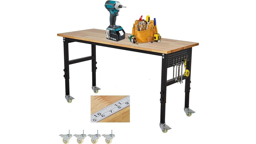 60 Adjustable Work Bench with Power Outlet, Heavy-Duty Rubber Wood Top, Wheels, 2000 LBS Capacity
