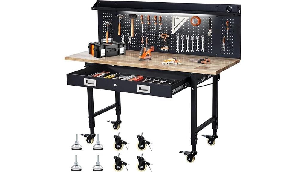 Looking for a versatile workbench that combines durability, mobility, and convenient storage? The 60-inch workbench with drawers and wheels fits the bill. Its adjustable height from 29.7 to 39.4 inches and heavy-duty load capacity of 2700 pounds make it perfect for demanding tasks. The bamboo top offers durability and eco-friendliness, while lockable casters ensure stability when needed. With a built-in power strip featuring USB ports, you can easily power tools and devices. Assembly is quick, often under 30 minutes, and its sturdy metal frame and organized drawers make it ideal for workshops, garages, or art studios.