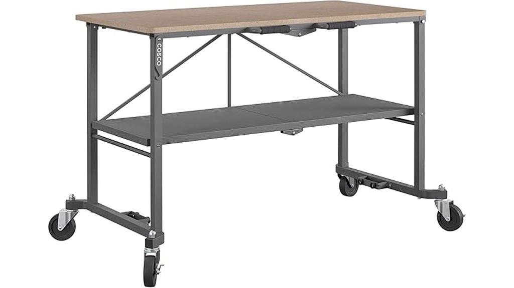 Need a portable work surface that combines durability with easy mobility? The COSCO SmartFold Portable Workbench is exactly that. Made from industrial-strength steel, it features a large 48 x 23.5-inch MDF top and a sturdy steel finish, supporting up to 600 pounds. Its locking casters keep it stable during work, while the quick fold design makes storage and transport effortless—requiring only wheel attachment upon delivery. Weighing about 52.8 pounds, it’s easy to move around your garage or workshop. Customers love its robust build, ample workspace, and ease of use, making it an excellent choice for DIY projects or home repairs.