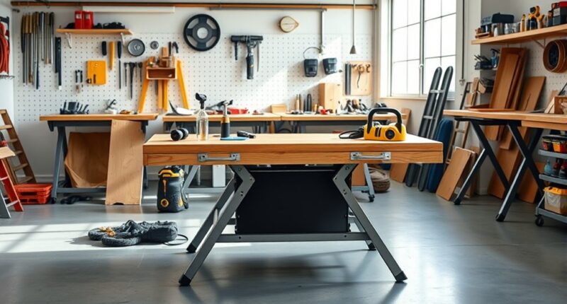 Imagine you’re working on a project, and suddenly, the workbench collapses. That’s why safety features are vital. I always look for sturdy locking mechanisms that secure the table in place, preventing accidental folding. Anti-slip feet are also indispensable to keep the workbench stable during use. These features guarantee my workspace stays safe, reducing the risk of injuries and mishaps while I focus on my tasks.